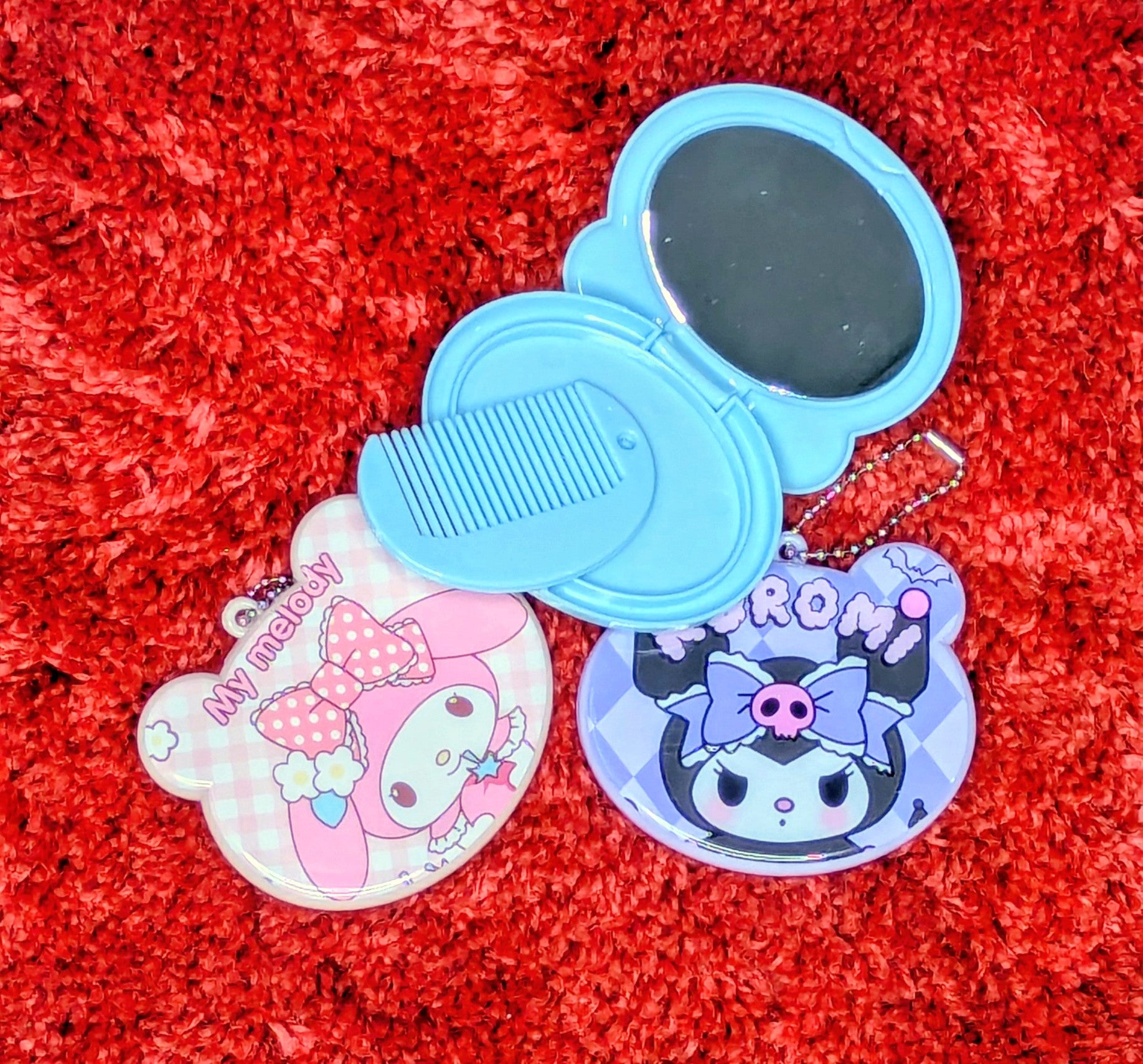 Makeup Mirror Theme: Kuromi, My Melody, and Cinnamoroll. Comb included.